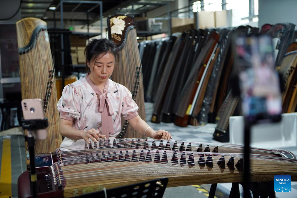 LANKAO, 14 mayo, 2024 (Xinhua) -- Imagen del 13 de mayo de 2024 de una trabajadora vendiendo guzheng, también conocido como cítara china, a través de transmisión en vivo, en el distrito de Lankao de la ciudad de Kaifeng, en la provincia de Henan, en el centro de China. En los últimos años, el distrito de Lankao ha desarrollado vigorosamente la industria de instrumentos musicales tradicionales en un esfuerzo por utilizar plenamente los árboles de paulownia, que abundan en el distrito. El distrito de Lankao alberga ahora más de 200 empresas de instrumentos musicales tradicionales, que proveen guzheng, guqin, pipa y otros instrumentos musicales tradicionales chinos. (Xinhua/Shao Zedong)