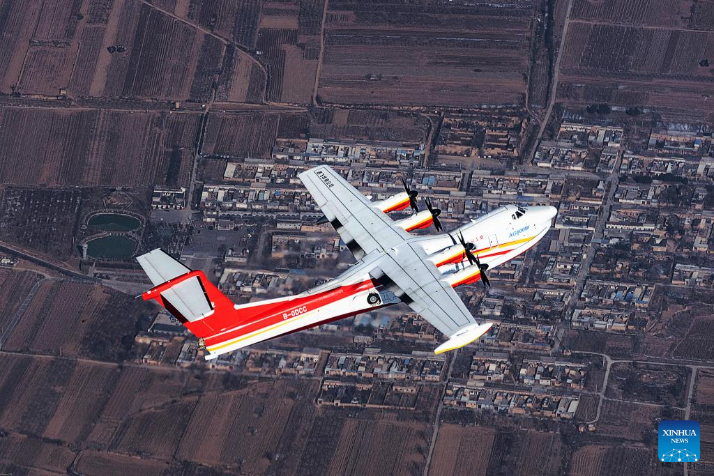 BEIJING, 16 mayo, 2024 (Xinhua) -- Imagen aérea del 27 de diciembre de 2023 del gran avión anfibio AG600 de China en un vuelo de prueba. El gran avión anfibio AG600 de China, desarrollado de forma independiente, ha completado recientemente su primer vuelo de prueba nocturno, según informó el desarrollador de la aeronave. (Xinhua/Corporación de la Industria de Aviación de China)