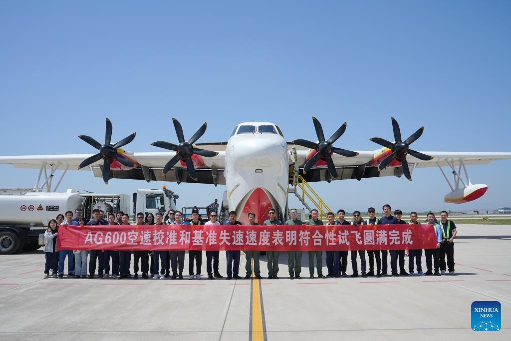 BEIJING, 16 mayo, 2024 (Xinhua) -- Imagen del 13 de mayo de 2024 de personas posando para una fotografía frente al gran avión anfibio AG600 de China en una base de vuelos de prueba para aviones civiles, en Pucheng, en la provincia de Shaanxi, en el noroeste de China. El gran avión anfibio AG600 de China, desarrollado de forma independiente, ha completado recientemente su primer vuelo de prueba nocturno, según informó el desarrollador de la aeronave. (Xinhua/Corporación de la Industria de Aviación de China)