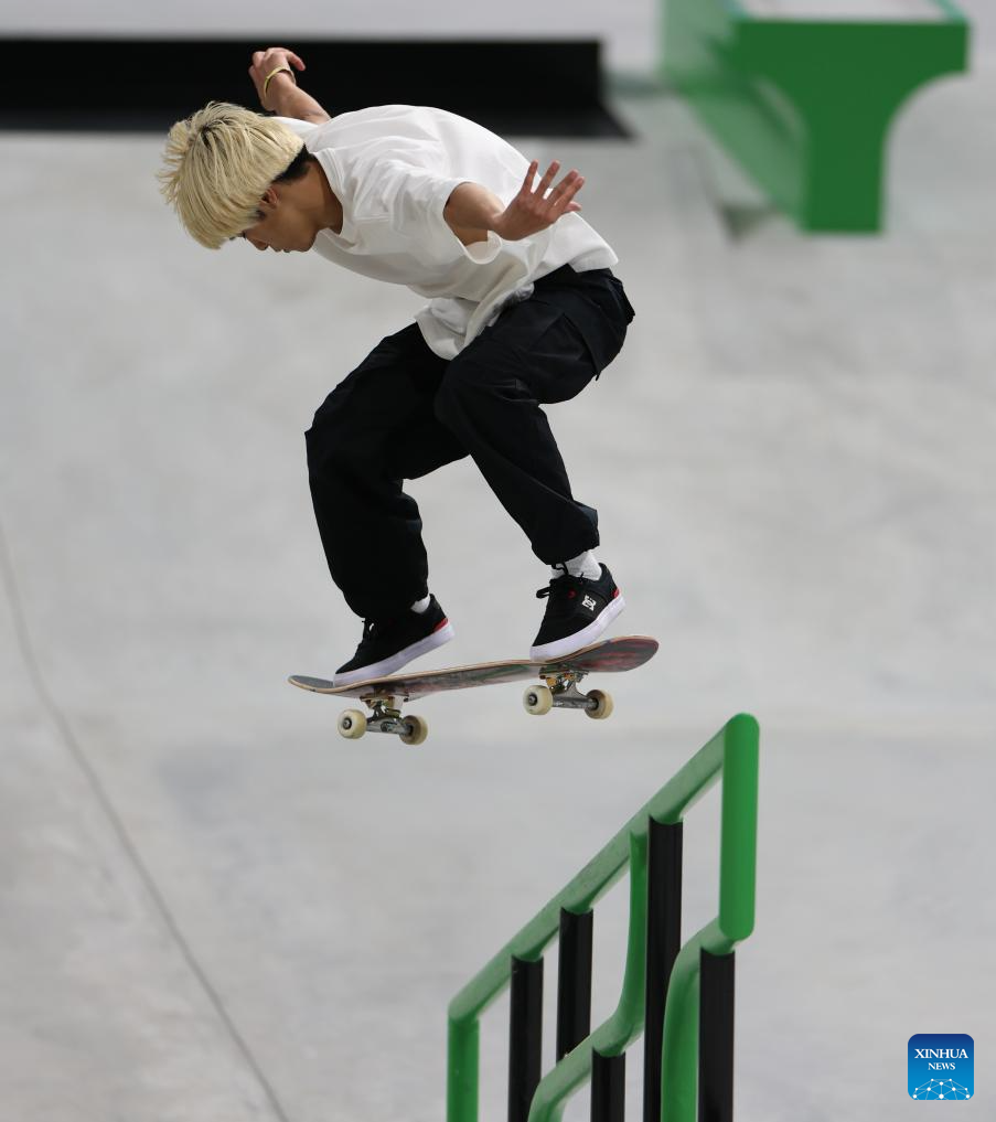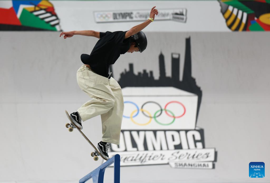 SHANGHAI, 16 mayo, 2024 (Xinhua) -- Zhang Jie, de China, compite durante los preliminares de street masculino de skateboarding en la Serie de Clasificación Olímpica de Shanghai, en Shanghai, en el este de China, el 16 de mayo de 2024. (Xinhua/Wang Kaiyan)