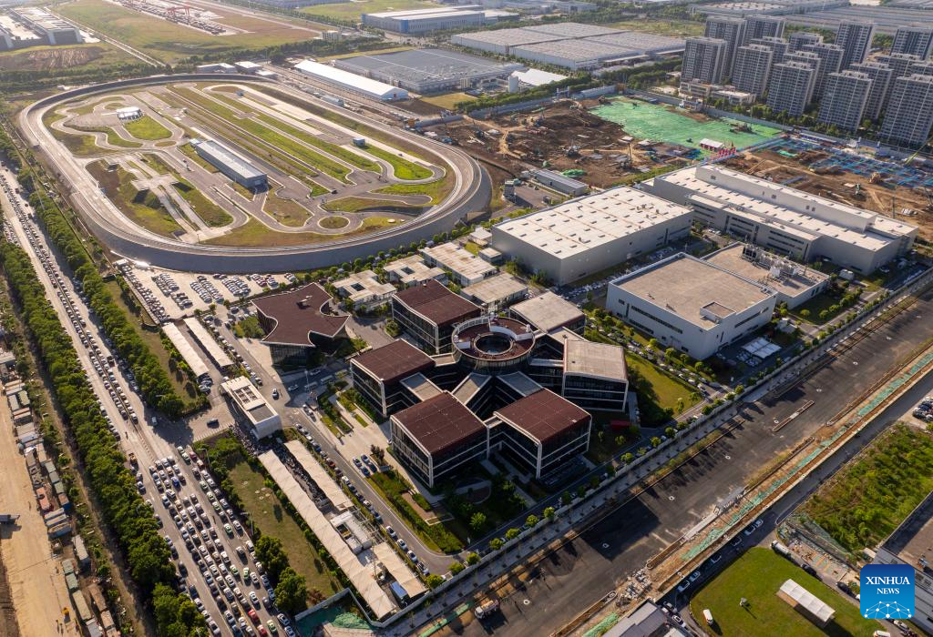 HEFEI, 16 mayo 2024 (Xinhua) -- Vista aérea tomada con un dron del 16 de mayo de 2024 de la pista de pruebas de ciudad de Volkswagen China Technology Company (VCTC), en Hefei, en la provincia de Anhui, en el este de China. VCTC lanzó la pista de pruebas de ciudad el jueves en la ciudad de Hefei, capital de la provincia de Anhui, en el este de China. La pista se enfoca en las pruebas de rendimiento y validaciones de funciones de vehículos inteligentes conectados, y es la primera de su tipo dentro del Grupo Volkswagen en China. Con una superficie de 200.000 metros cuadrados, la pista permite pruebas y ajustes del vehículo en tiempo real y acelera la velocidad de iteración del desarrollo de aplicaciones de software y hardware. (Xinhua)