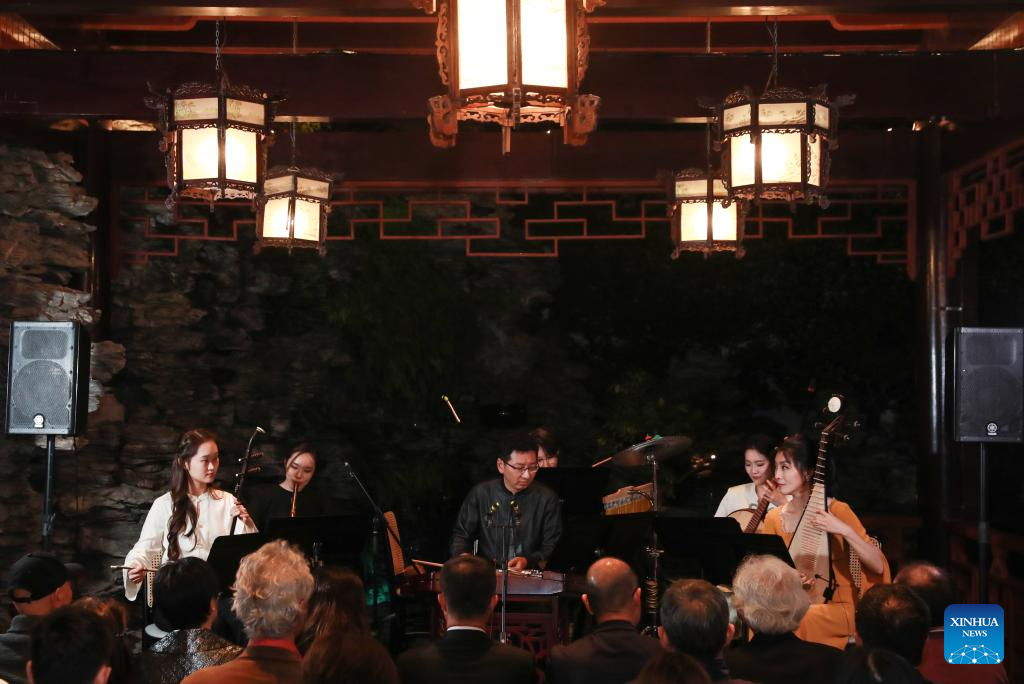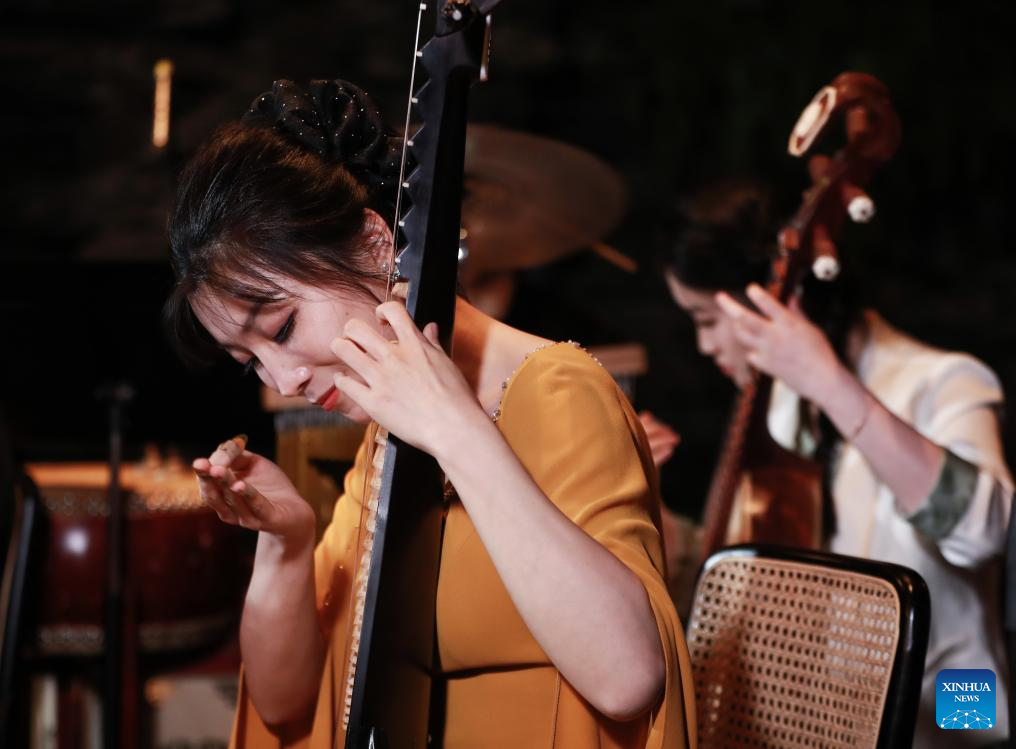 SIDNEY, 15 mayo, 2024 (Xinhua) -- Músicos del Conservatorio de Música de China realizan una presentación de música folklórica china con el tema "Balada de pipa: Cuerdas a través de las estaciones" en el Jardín Chino de la Amistad, en Sídney, Australia, el 15 de mayo de 2024. (Xinhua/Ma Ping)