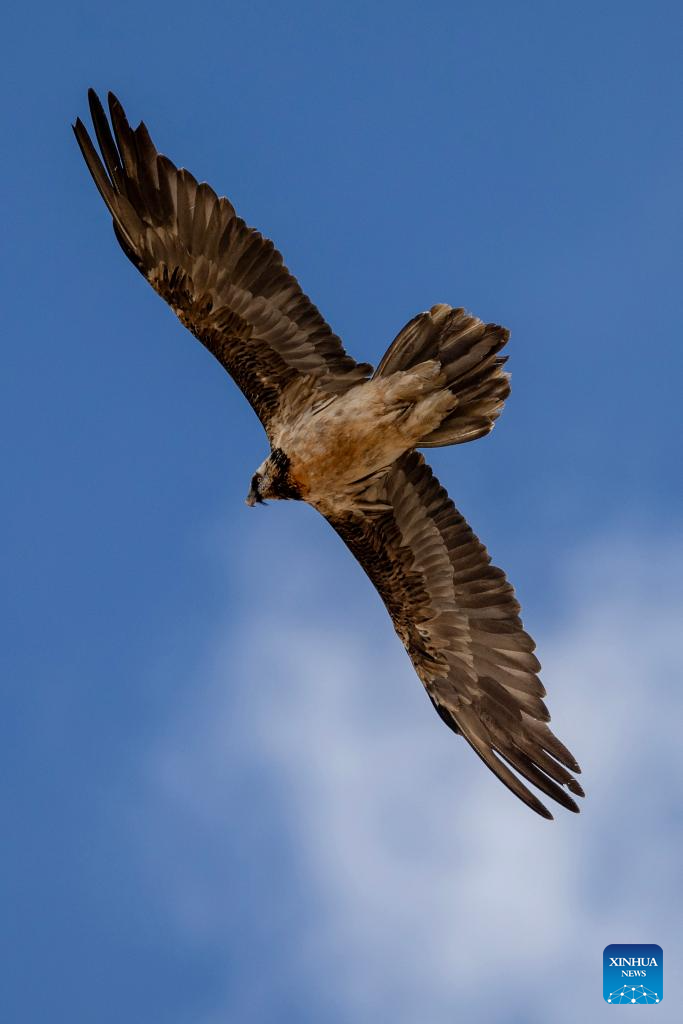 NAGQU, 13 mayo, 2024 (Xinhua) -- Imagen del 10 de mayo de 2024 de un quebrantahuesos en la Reserva Natural Nacional de Changtang, en el distrito de Nyima de la ciudad de Nagqu, en la región autónoma de Xizang, en el suroeste de China. Apodada el "paraíso de los animales salvajes", la Reserva Natural Nacional de Changtang alberga más de 30 tipos de animales salvajes incluidos en el catálogo de protección a nivel nacional de China, entre ellos antílopes tibetanos y yaks salvajes.(Xinhua/Jiang Fan)