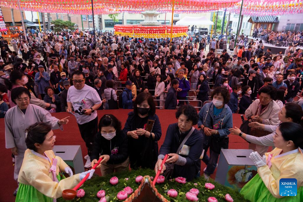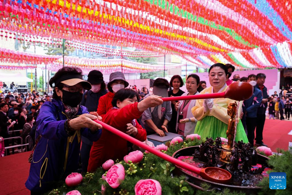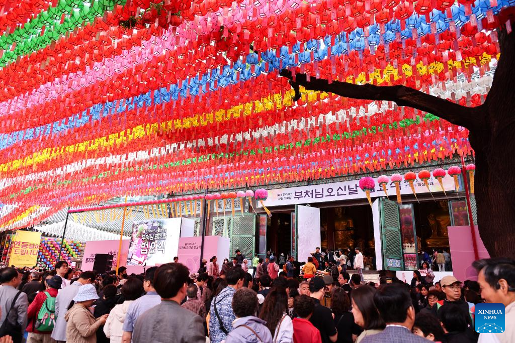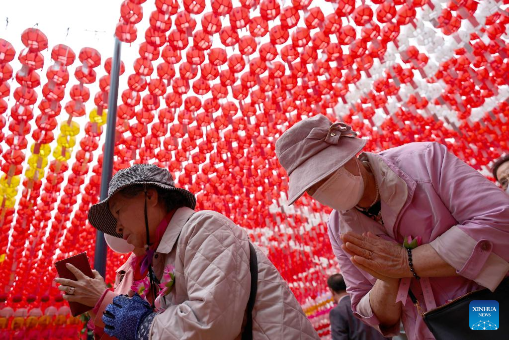 SEUL, 16 mayo 2024 (Xinhua) -- Imagen del 15 de mayo de 2024 de personas asistiendo a un servicio para celebrar el cumpleaños de Buda en el Templo Jogyesa, en Seúl, República de Corea. (Xinhua/Jun Hyosang)