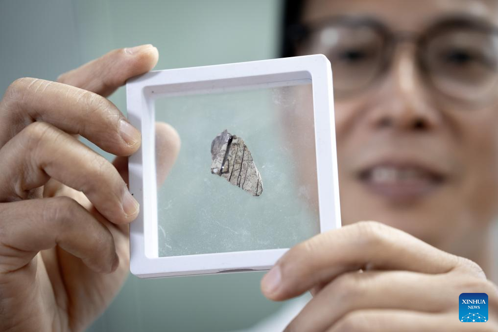 GUANGZHOU, 16 mayo, 2024 (Xinhua) -- Imagen del 14 de mayo de 2024 de un diente de dinosaurio fosilizado. Cuatro grandes dientes de dinosaurios desenterrados en la provincia de Guangdong han sido confirmados por científicos chinos y pertenecen al grupo Tyrannosauroidea que data de hace 70 y 66 millones de años, lo que la convierte en la evidencia fósil más australde este taxón en China.(Xinhua/Dong Tianjian)