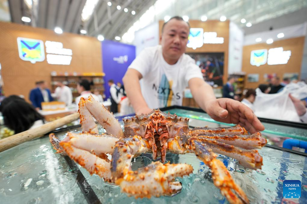 HARBIN, 18 mayo, 2024 (Xinhua) -- Un expositor arregla un cangrejo rey ruso durante la VIII Exposición China-Rusia, en Harbin, en la provincia de Heilongjiang, en el noreste de China, el 18 de mayo de 2024. La exposición abrió sus puertas al público el sábado. Las actividades de la exposición se celebran en Harbin del 16 al 21 de mayo. Más de 5.000 compradores extranjeros se registraron en la exposición y representantes de 44 países y regiones participaron en la misma. (Xinhua/Wang Jianwei)