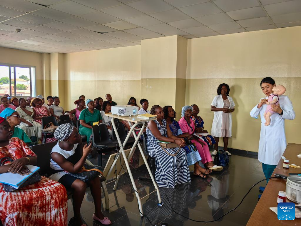 MALABO, 18 mayo, 2024 (Xinhua) -- Imagen del 15 de mayo de 2024 de Gao Hang (d), obstetra del equipo médico chino, impartiendo una sesión de capacitación a trabajadores médicos locales en el Hospital Regional de Malabo, en Malabo, Guinea Ecuatorial. El 33 grupo del equipo médico chino en Guinea Ecuatorial ha estado brindando servicios médicos a la población de Guinea Ecuatorial desde diciembre de 2023. (Xinhua/El 33 grupo de equipos médicos chinos en Guinea Ecuatorial)