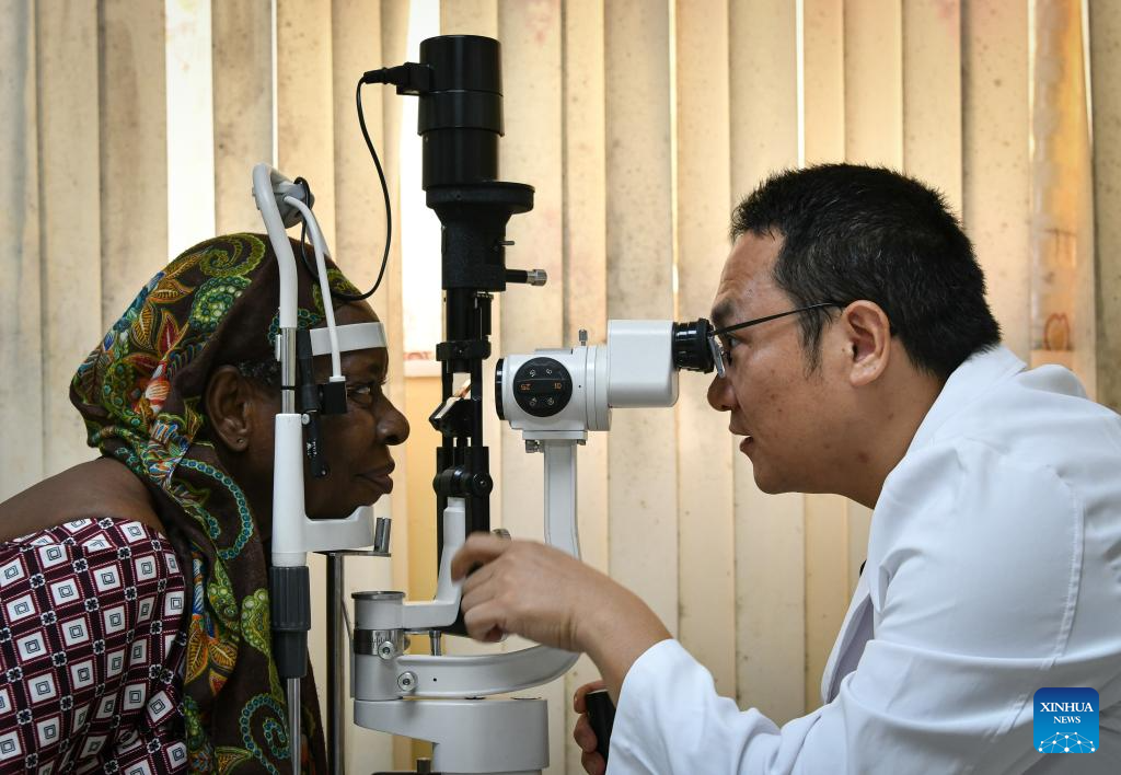 MALABO, 18 mayo, 2024 (Xinhua) -- Imagen del 16 de mayo de 2024 de Xie Hongbin (d), oftalmólogo del equipo médico chino, examinando los ojos de una paciente en el Hospital Regional de Malabo, en Malabo, Guinea Ecuatorial. El 33 grupo del equipo médico chino en Guinea Ecuatorial ha estado brindando servicios médicos a la población de Guinea Ecuatorial desde diciembre de 2023. (Xinhua/Han Xu)