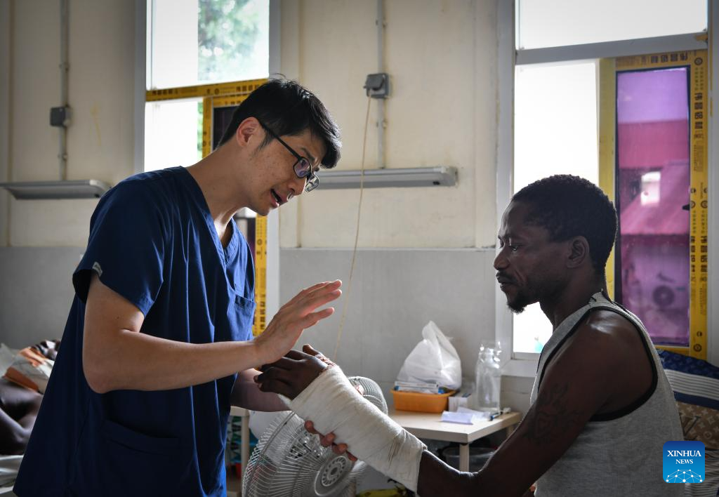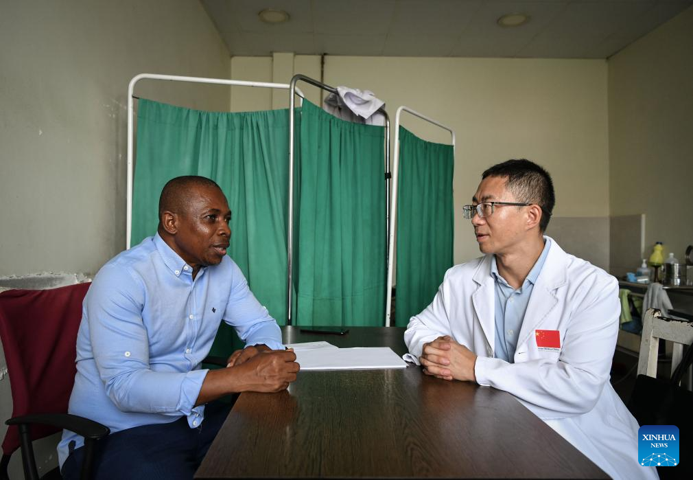 MALABO, 18 mayo, 2024 (Xinhua) -- Imagen del 16 de mayo de 2024 de Fang Ming (i), ortopedista del equipo médico chino, hablando con un paciente en el Hospital Regional de Malabo, en Malabo, Guinea Ecuatorial. El 33 grupo del equipo médico chino en Guinea Ecuatorial ha estado brindando servicios médicos a la población de Guinea Ecuatorial desde diciembre de 2023. (Xinhua/Han Xu)