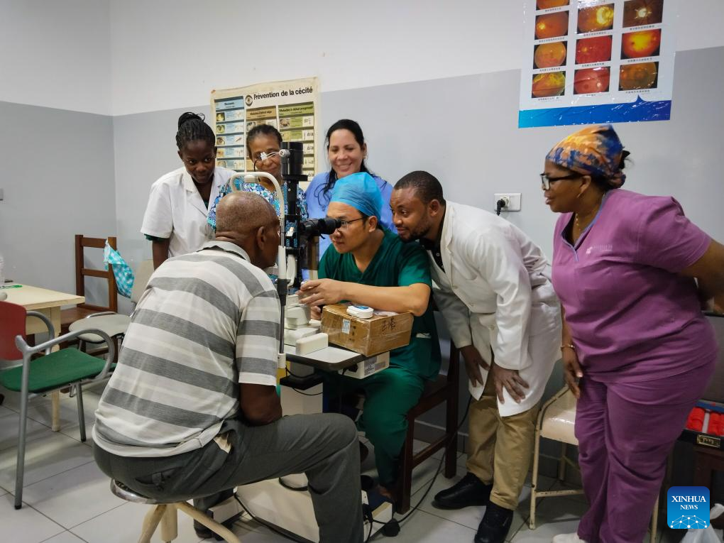 MALABO, 18 mayo, 2024 (Xinhua) -- Imagen del 15 de mayo de 2024 de Xie Hongbin (3-d), oftalmólogo del equipo médico chino, guiando a sus colegas cubanos y ecuatoguineanos para comprobar la recuperación de los ojos de un paciente tras la cirugía en el Hospital Regional de Malabo, en Malabo, Guinea Ecuatorial. El 33 grupo del equipo médico chino en Guinea Ecuatorial ha estado brindando servicios médicos a la población de Guinea Ecuatorial desde diciembre de 2023. (Xinhua/El 33 grupo de equipos médicos chinos en Guinea Ecuatorial)