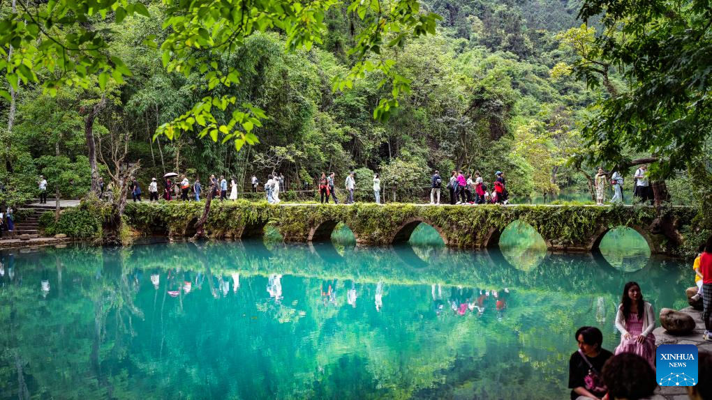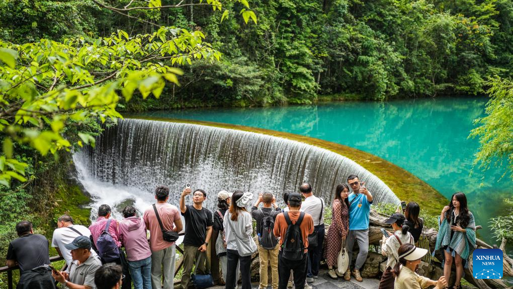 LIBO, 17 mayo, 2024 (Xinhua) -- Imagen del 16 de mayo de 2024 de turistas visitando el área escénica de Xiaoqikong, en el distrito de Libo, en la provincia de Guizhou, en el suroeste de China. Situado en la escarpada ladera de la montaña de Guizhou, el distrito de Libo ofrece vistas espectaculares en abundancia y ha experimentado un auge del turismo en los últimos años. (Xinhua/Tao Liang)
