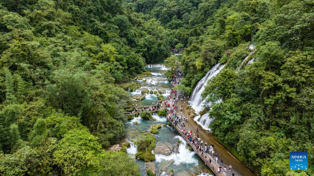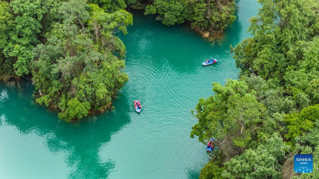 LIBO, 17 mayo, 2024 (Xinhua) -- Vista aérea tomada con un dron del 16 de mayo de 2024 de turistas visitando el área escénica de Xiaoqikong, en el distrito de Libo, en la provincia de Guizhou, en el suroeste de China. Situado en la escarpada ladera de la montaña de Guizhou, el distrito de Libo ofrece vistas espectaculares en abundancia y ha experimentado un auge del turismo en los últimos años. (Xinhua/Tao Liang)