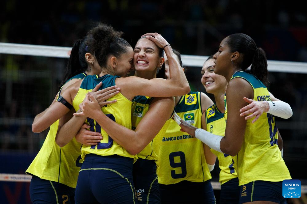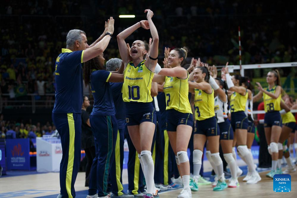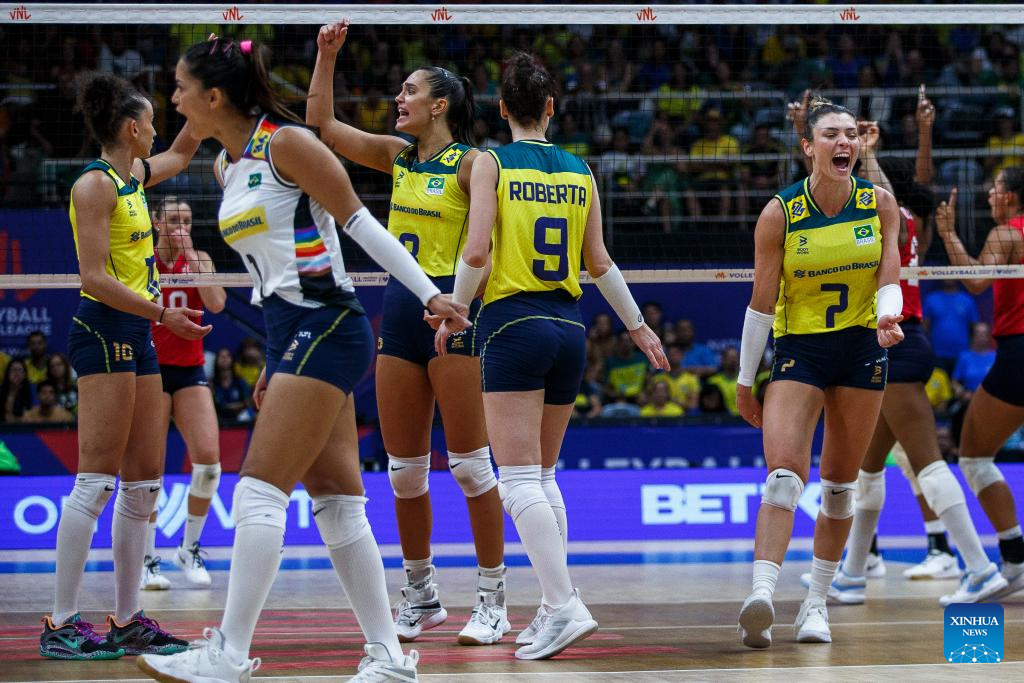 RIO DE JANEIRO, 18 mayo, 2024 (Xinhua) -- Imagen del 17 de mayo de 2024 de jugadoras de Brasil festejando durante el partido de la ronda preliminar de la Liga de Naciones de Voleibol 2024 femenina de la Federación Internacional de Voleibol (FIVB) entre Brasil y Estados Unidos, en Río de Janeiro, Brasil. (Xinhua/Claudia Martini)