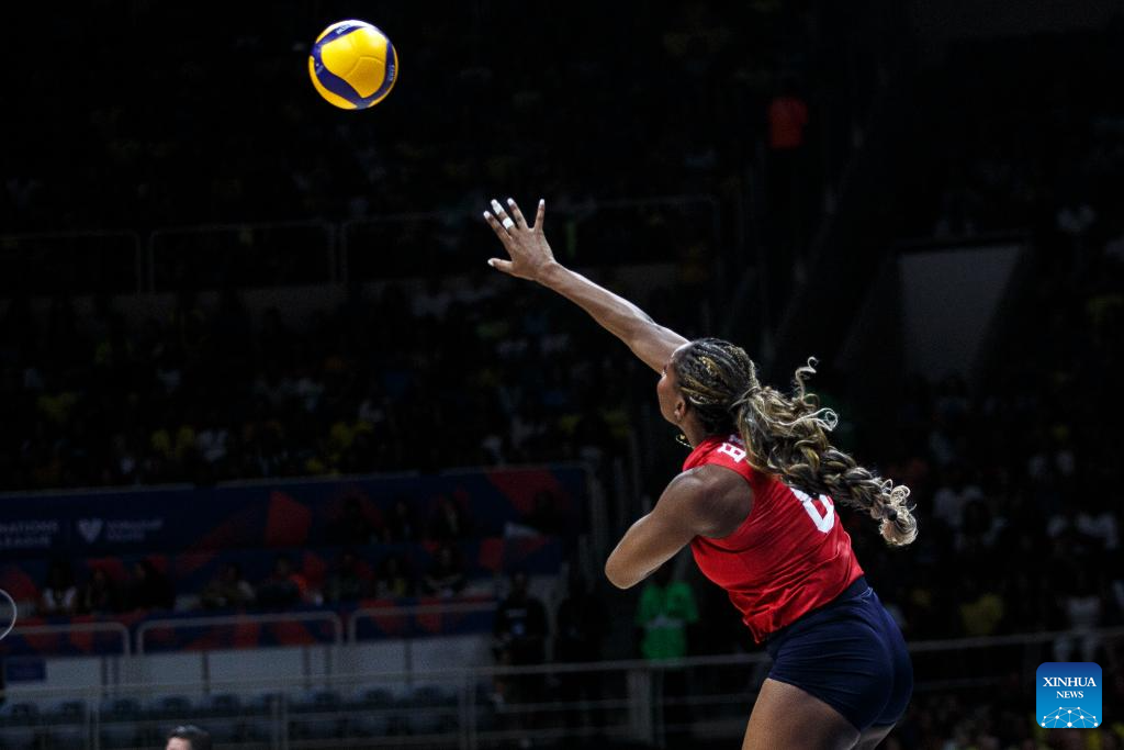 RIO DE JANEIRO, 18 mayo, 2024 (Xinhua) -- Imagen del 17 de mayo de 2024 de Brionne Butler, de Estados Unidos, sirviendo el balón durante el partido de la ronda preliminar de la Liga de Naciones de Voleibol 2024 femenina de la Federación Internacional de Voleibol (FIVB) entre Brasil y Estados Unidos, en Río de Janeiro, Brasil. (Xinhua/Claudia Martini)