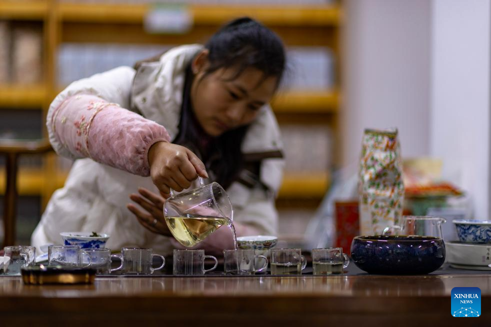 LHASA, 14 mayo, 2024 (Xinhua) -- Imagen del 24 de abril de 2024 de una aldeana preparando té para los turistas, en la aldea Gelin del distrito de Medog, en la región autónoma de Xizang, en el suroeste de China. (Xinhua/Jiang Fan)