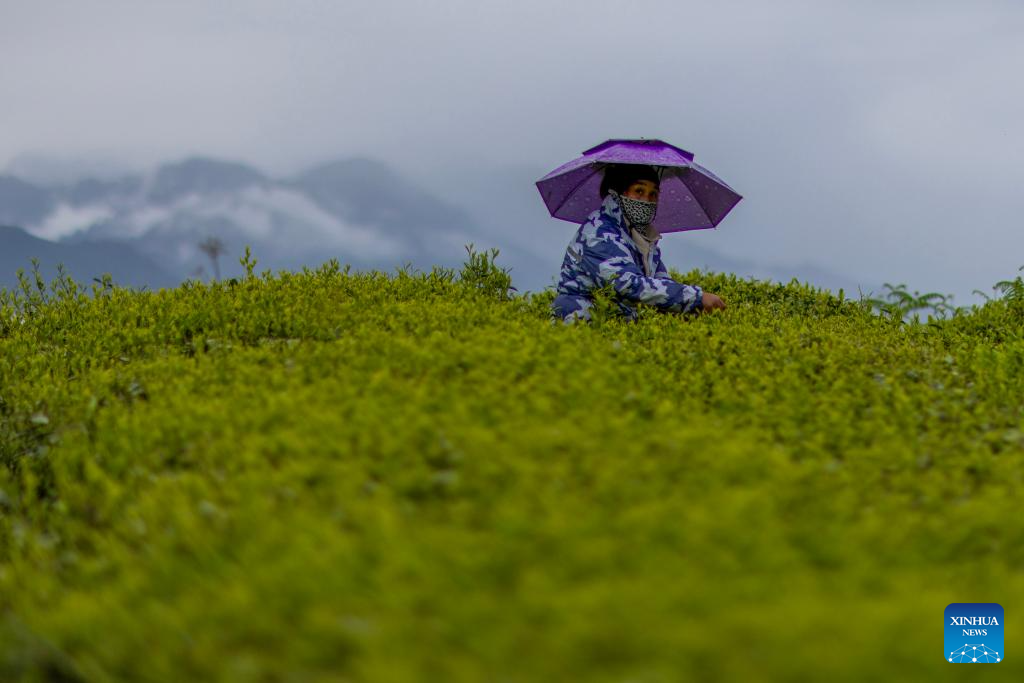 LHASA, 14 mayo, 2024 (Xinhua) -- Imagen del 24 de abril de 2024 de una aldeana recolectando hojas de té en un jardín de té, en la aldea Gelin del distrito de Medog, en la región autónoma de Xizang, en el suroeste de China. (Xinhua/Jiang Fan)