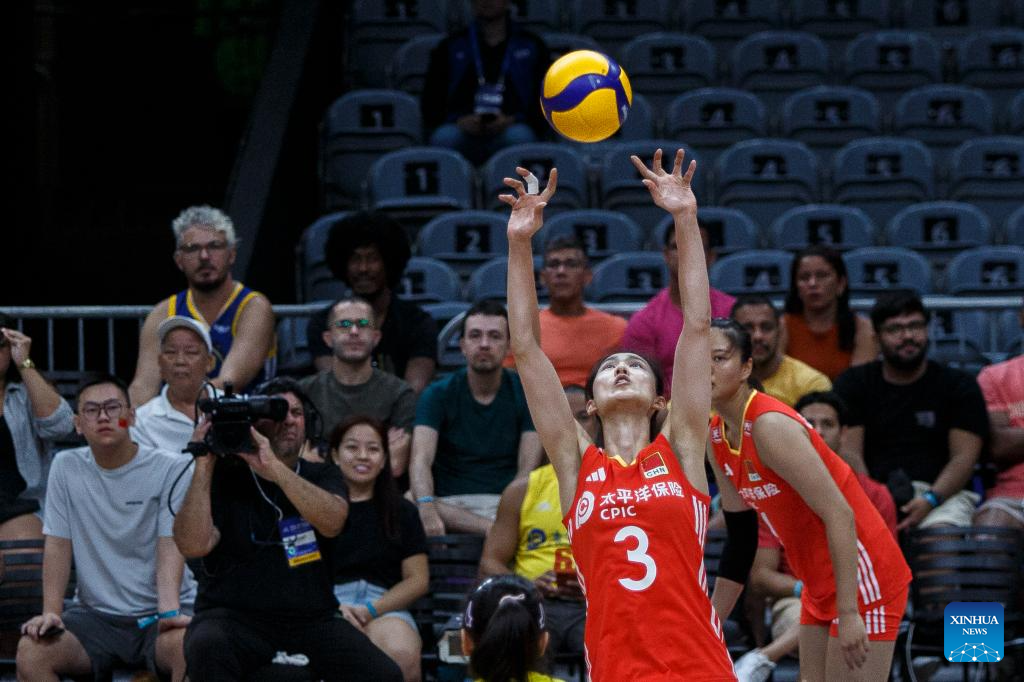 RIO DE JANEIRO, 18 mayo, 2024 (Xinhua) -- Diao Linyu, de China, compite durante el partido de la ronda preliminar de la Liga de Naciones de Voleibol 2024 femenina de la Federación Internacional de Voleibol (FIVB) entre Serbia y China, en Río de Janeiro, Brasil, el 18 de mayo de 2024. (Xinhua/Claudia Martini)