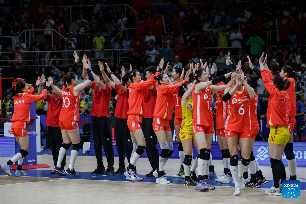 RIO DE JANEIRO, 18 mayo, 2024 (Xinhua) -- Jugadoras del equipo de China festejan al término del partido de la ronda preliminar de la Liga de Naciones de Voleibol 2024 femenina de la Federación Internacional de Voleibol (FIVB) entre Serbia y China, en Río de Janeiro, Brasil, el 18 de mayo de 2024. (Xinhua/Claudia Martini)