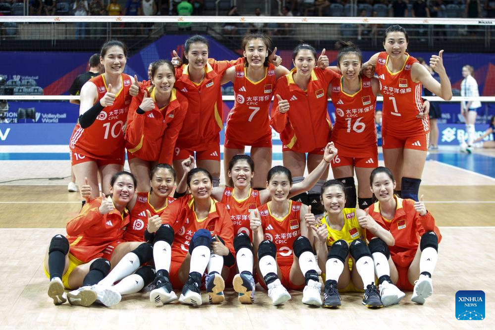 RIO DE JANEIRO, 18 mayo, 2024 (Xinhua) -- Jugadoras de China posan para fotografías al término del partido de la ronda preliminar de la Liga de Naciones de Voleibol 2024 femenina de la Federación Internacional de Voleibol (FIVB) entre Serbia y China, en Río de Janeiro, Brasil, el 18 de mayo de 2024. (Xinhua/Claudia Martini)