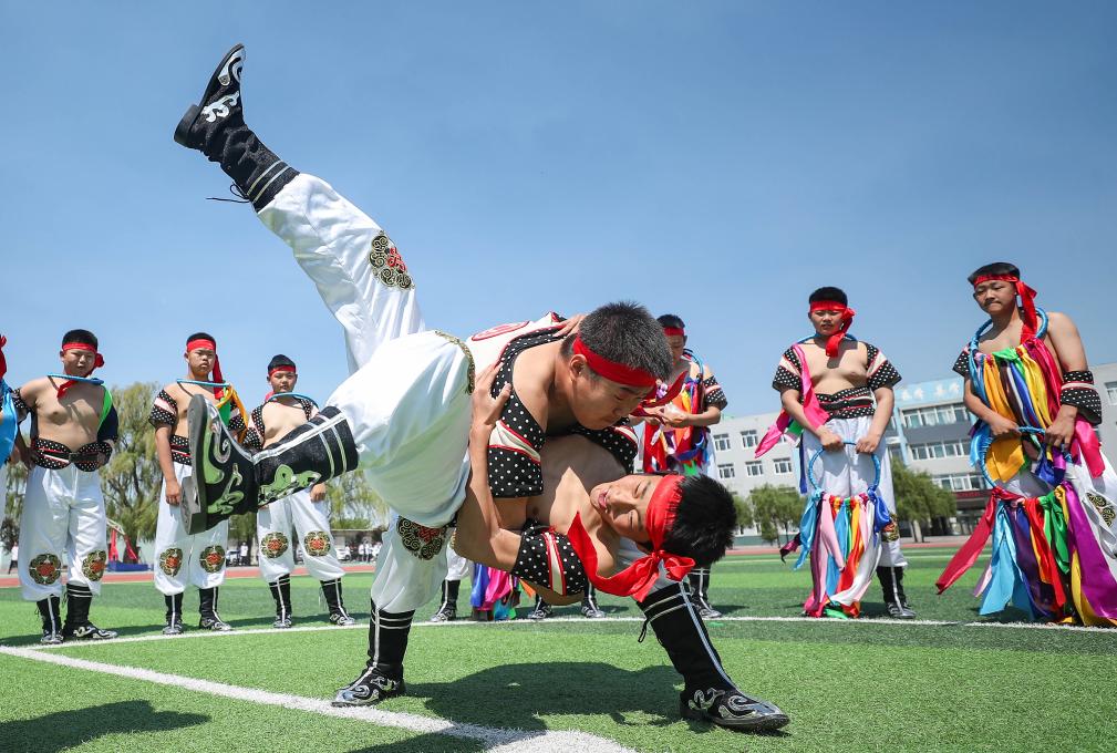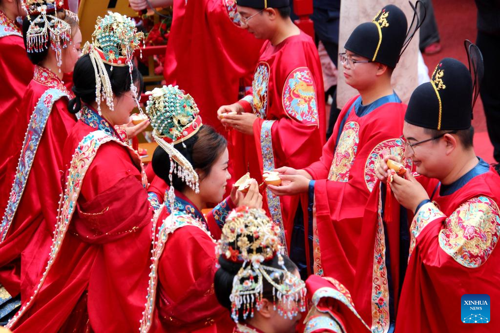 SHIYAN, 20 mayo, 2024 (Xinhua) -- Parejas vestidas con trajes tradicionales participan en una boda grupal en Shiyan, en la provincia de Hubei, en el centro de China, el 20 de mayo de 2024. Diez parejas participaron en una boda grupal aquí el lunes. (Xinhua/Cao Zhongzhong)