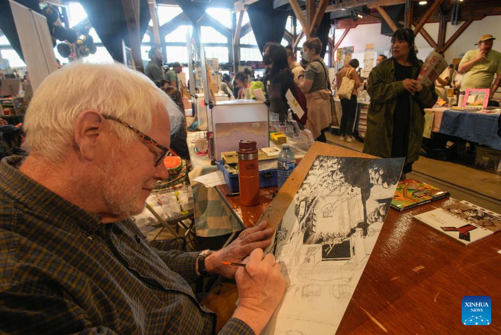VANCOUVER, 20 mayo, 2024 (Xinhua) -- Imagen del 19 de mayo de 2024 de un artista de cómics trabajando en su cómic durante el Festival de Arte del Cómic de Vancouver 2024, en Vancouver, Columbia Británica, Canadá. El Festival de Arte del Cómic de Vancouver, una celebración anual del cómic y la novela gráfica y sus creadores, que incluye una exposición y una feria de vendedores, cuenta este año con más de un centenar de creadores de cómic de todo el mundo. (Xinhua/Liang Sen)