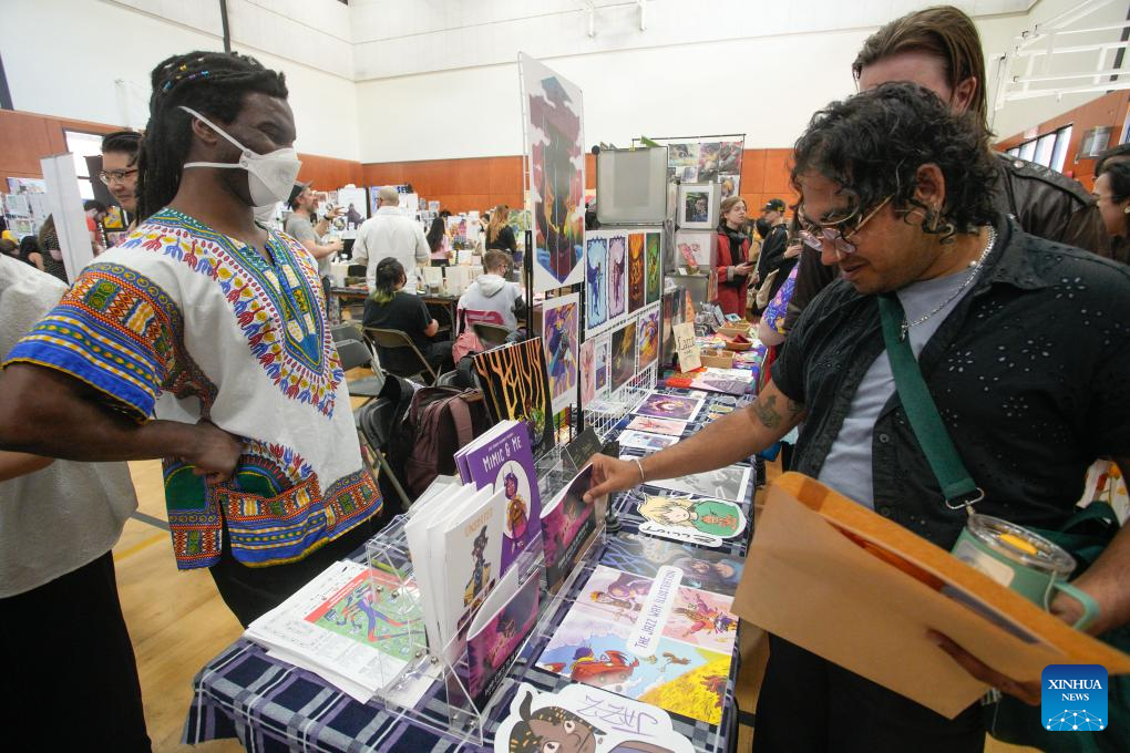 VANCOUVER, 20 mayo, 2024 (Xinhua) -- Imagen del 19 de mayo de 2024 de personas visitando el estand de un expositor durante el Festival de Arte del Cómic de Vancouver 2024 en Vancouver, Columbia Británica, Canadá. El Festival de Arte del Cómic de Vancouver, una celebración anual del cómic y la novela gráfica y sus creadores, que incluye una exposición y una feria de vendedores, cuenta este año con más de un centenar de creadores de cómic de todo el mundo. (Xinhua/Liang Sen)