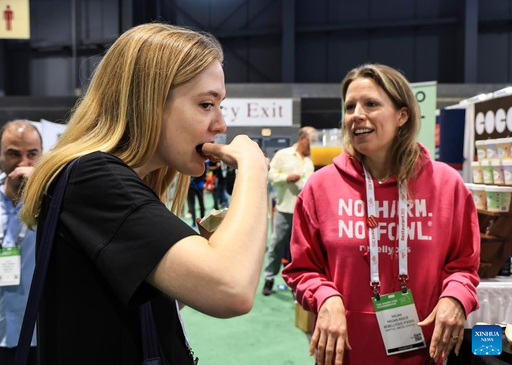 CHICAGO, 20 mayo, 2024 (Xinhua) -- Imagen del 19 de mayo de 2024 de una asistente probando algunos alimentos durante el Espectáculo de la Asociación Nacional de Restaurantes 2024 en McCormick Place, en Chicago, en el estado de Illinois, Estados Unidos. Más de 2.240 expositores participaron en el espectáculo. (Xinhua/Joel Lerner)