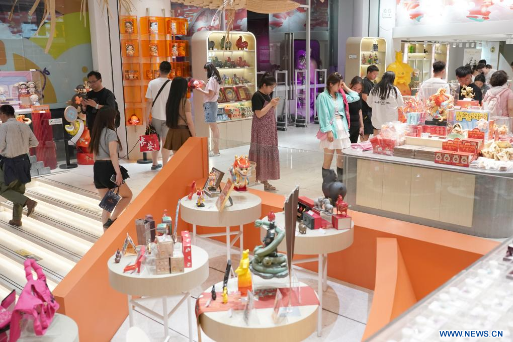 XI'AN, 21 mayo, 2024 (Xinhua) -- Imagen del 20 de mayo de 2024 de turistas seleccionando productos culturales y de creación en una tienda en el centro comercial Great Tang All Day Mall, en Xi'an, capital de la provincia de Shaanxi, en el noroeste de China. Xi'an, una de las antiguas capitales de la historia china, atrae a un número creciente de turistas en los últimos años. (Xinhua/Shao Rui)