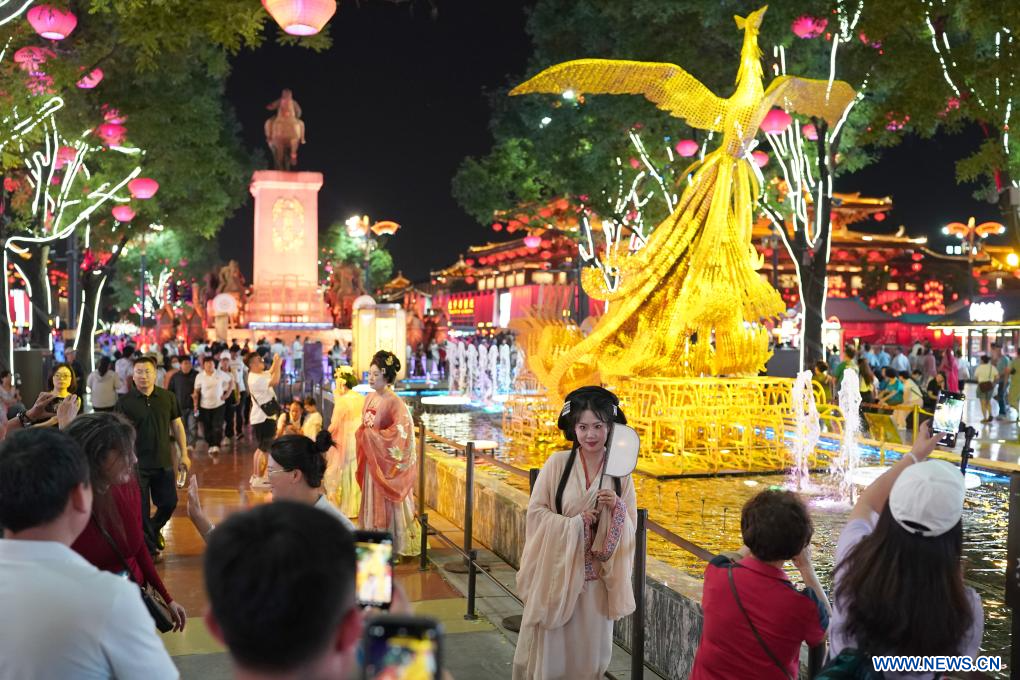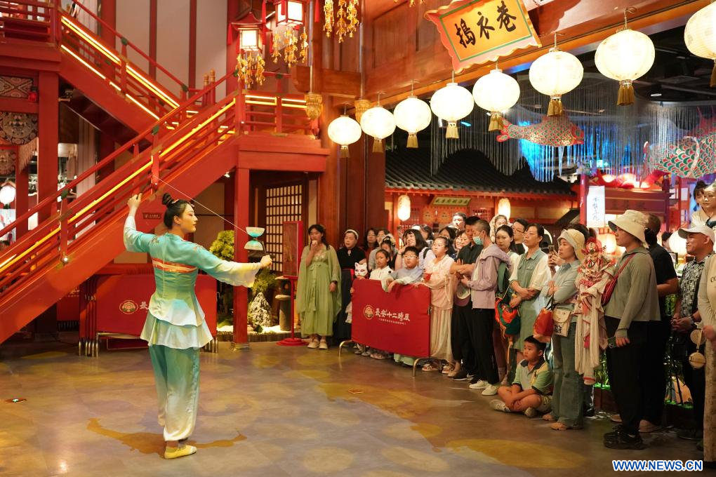 XI'AN, 21 mayo, 2024 (Xinhua) -- Imagen del 20 de mayo de 2024 de turistas visitando el centro comercial Great Tang All Day Mall, en Xi'an, capital de la provincia de Shaanxi, en el noroeste de China. Xi'an, una de las antiguas capitales de la historia china, atrae a un número creciente de turistas en los últimos años. (Xinhua/Shao Rui)