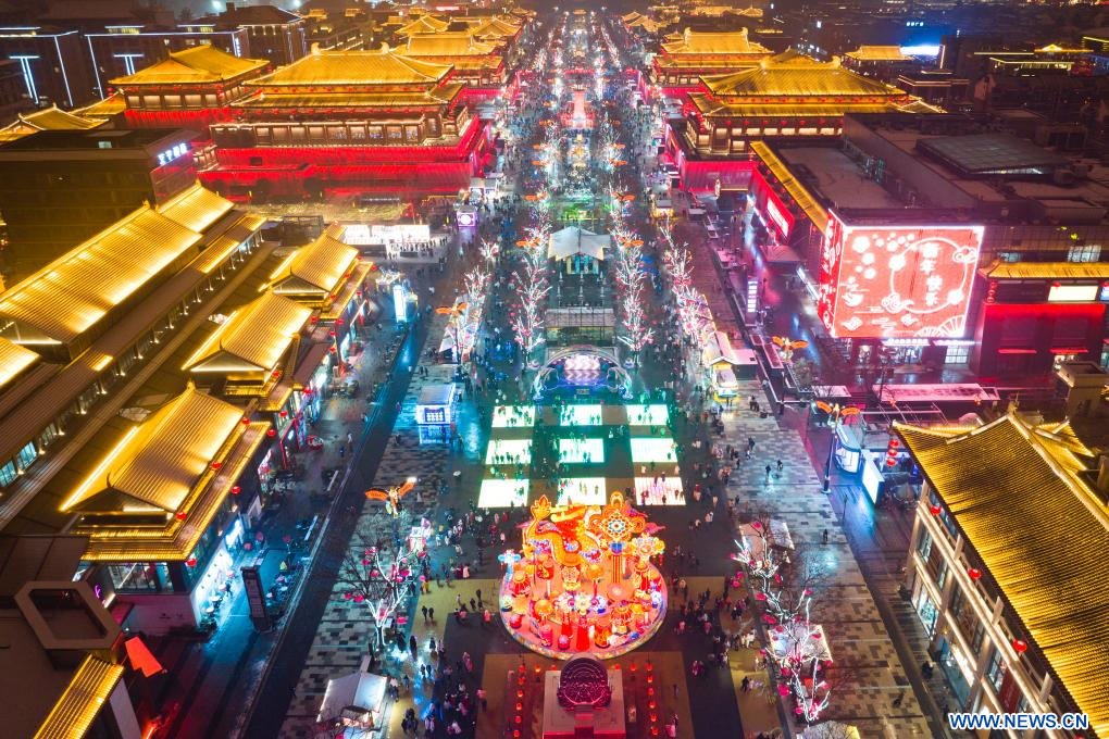 XI'AN, 21 mayo, 2024 (Xinhua) -- Imagen aérea tomada con un dron el 2 de febrero de 2024 de una vista del centro comercial Great Tang All Day Mall, en Xi'an, capital de la provincia de Shaanxi, en el noroeste de China. Xi'an, una de las antiguas capitales de la historia china, atrae a un número creciente de turistas en los últimos años. (Xinhua/Shao Rui)