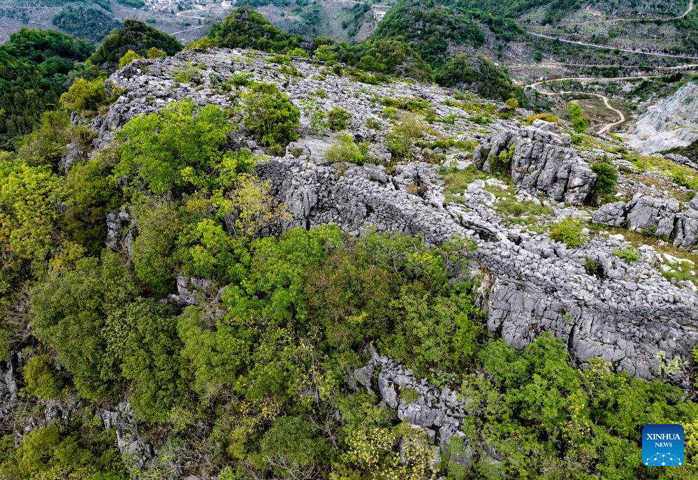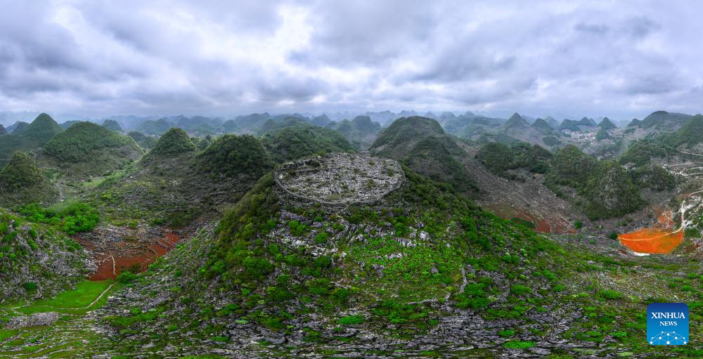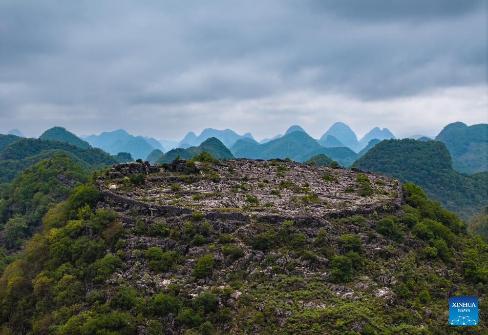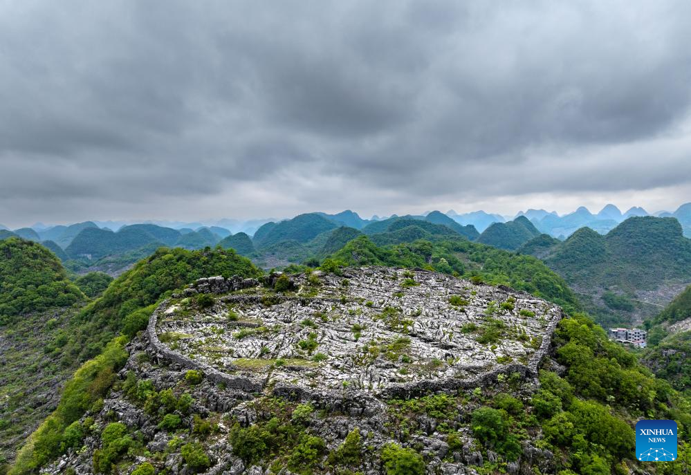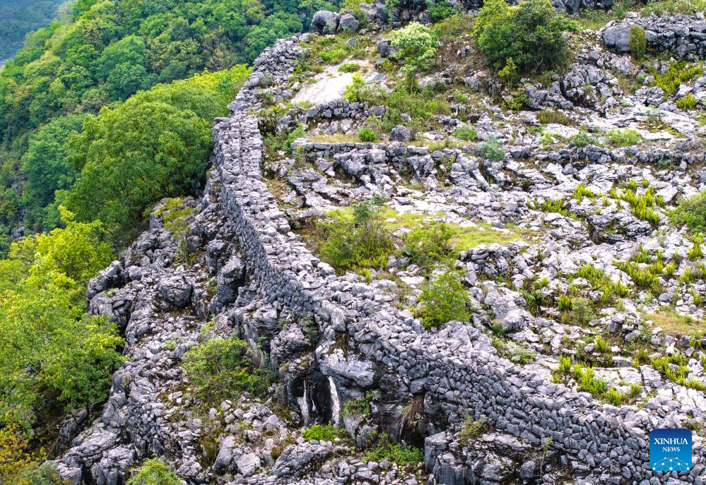 GUIYANG, 21 mayo, 2024 (Xinhua) -- Vista aérea tomada con dron el 16 de mayo de 2024 de antiguas fortificaciones que datan de la dinastía Qing (1644-1911) en la cima de una colina, en la aldea de Longan de la ciudad de Xingyi, en la provincia de Guizhou, en el suroeste de China. (Xinhua/Liu Xu)