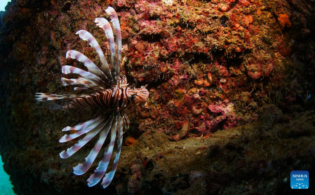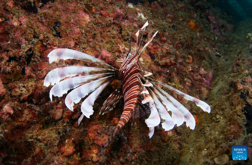 SANYA, 21 mayo, 2024 (Xinhua) -- Imagen del 17 de mayo de 2024 de un pez león visto en el rancho marino de la isla Wuzhizhou, en Sanya, en la provincia de Hainan, en el sur de China. El rancho marino de la isla Wuzhizhou, el primer rancho marino tropical de China, ha logrado avances notables en la restauración ecológica y la conservación de los recursos pesqueros marinos. Los arrecifes artificiales son utilizados en todo el mundo para mejorar la ecología oceánica, mediante la creación de hábitats adicionales para organismos acuáticos y los peces locales. Hasta abril de 2024, el rancho marino ha desplegado aproximadamente 80.000 metros cúbicos de arrecifes artificiales y arrecifes de barcos. Estos esfuerzos han creado un próspero ecosistema marino, con arrecifes de coral, peces, camarones y moluscos. Las estadísticas revelan que más de 51.000 corales han sido trasplantados con éxito en las aguas alrededor de la isla Wuzhizhou. El área ahora alberga más de 300 especies de peces de arrecife de coral, mostrando la rica biodiversidad que se ha nutrido a través de estos esfuerzos de conservación. (Xinhua/Yang Guanyu)