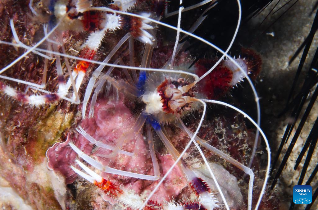 SANYA, 21 mayo, 2024 (Xinhua) -- Imagen del 16 de mayo de 2024 de camarones de coral con bandas azules vistos en el rancho marino de la isla Wuzhizhou, en Sanya, en la provincia de Hainan, en el sur de China. El rancho marino de la isla Wuzhizhou, el primer rancho marino tropical de China, ha logrado avances notables en la restauración ecológica y la conservación de los recursos pesqueros marinos. Los arrecifes artificiales son utilizados en todo el mundo para mejorar la ecología oceánica, mediante la creación de hábitats adicionales para organismos acuáticos y los peces locales. Hasta abril de 2024, el rancho marino ha desplegado aproximadamente 80.000 metros cúbicos de arrecifes artificiales y arrecifes de barcos. Estos esfuerzos han creado un próspero ecosistema marino, con arrecifes de coral, peces, camarones y moluscos. Las estadísticas revelan que más de 51.000 corales han sido trasplantados con éxito en las aguas alrededor de la isla Wuzhizhou. El área ahora alberga más de 300 especies de peces de arrecife de coral, mostrando la rica biodiversidad que se ha nutrido a través de estos esfuerzos de conservación. (Xinhua/Yang Guanyu)