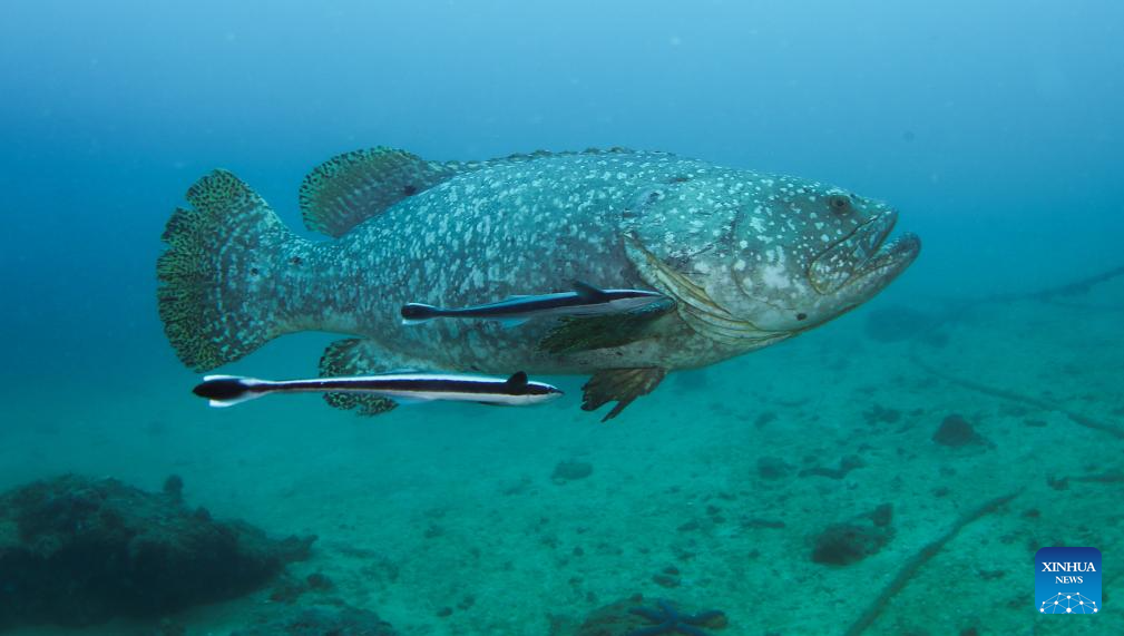 SANYA, 21 mayo, 2024 (Xinhua) -- Imagen del 17 de mayo de 2024 de un mero visto en el rancho marino de la isla Wuzhizhou, en Sanya, en la provincia de Hainan, en el sur de China. El rancho marino de la isla Wuzhizhou, el primer rancho marino tropical de China, ha logrado avances notables en la restauración ecológica y la conservación de los recursos pesqueros marinos. Los arrecifes artificiales son utilizados en todo el mundo para mejorar la ecología oceánica, mediante la creación de hábitats adicionales para organismos acuáticos y los peces locales. Hasta abril de 2024, el rancho marino ha desplegado aproximadamente 80.000 metros cúbicos de arrecifes artificiales y arrecifes de barcos. Estos esfuerzos han creado un próspero ecosistema marino, con arrecifes de coral, peces, camarones y moluscos. Las estadísticas revelan que más de 51.000 corales han sido trasplantados con éxito en las aguas alrededor de la isla Wuzhizhou. El área ahora alberga más de 300 especies de peces de arrecife de coral, mostrando la rica biodiversidad que se ha nutrido a través de estos esfuerzos de conservación. (Xinhua/Yang Guanyu)