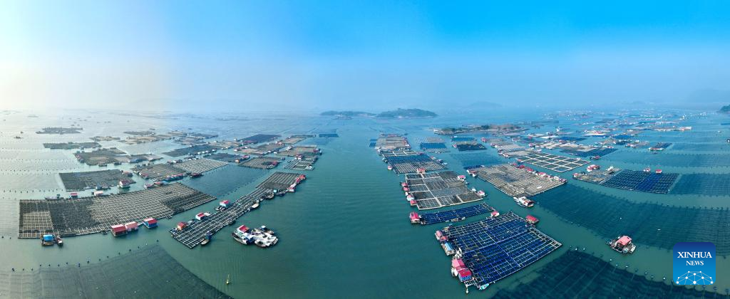 FUZHOU, 21 mayo, 2024 (Xinhua) -- Imagen panorámica aérea tomada con un dron del 11 de enero de 2024 de una zona de maricultura, en el distrito de Xiapu, en la provincia de Fujian, en el sureste de China. Situada junto al Mar Oriental de China, la provincia de Fujian cuenta con una superficie marítima de 136.000 kilómetros cuadrados, una costa escarpada y numerosas bahías e islas, lo que la convierte en un lugar óptimo para el desarrollo de la maricultura. A lo largo de los años, Fujian se ha concentrado en aumentar los suministros de alimentos pesqueros marinos de alta calidad, y acelerar la mejora de la maricultura al tiempo que protege el entorno ecológico marino. En 2023, la producción de maricultura de Fujian fue de casi 5,8 millones de toneladas, ocupando el segundo lugar en el país. (Xinhua/Jiang Kehong)