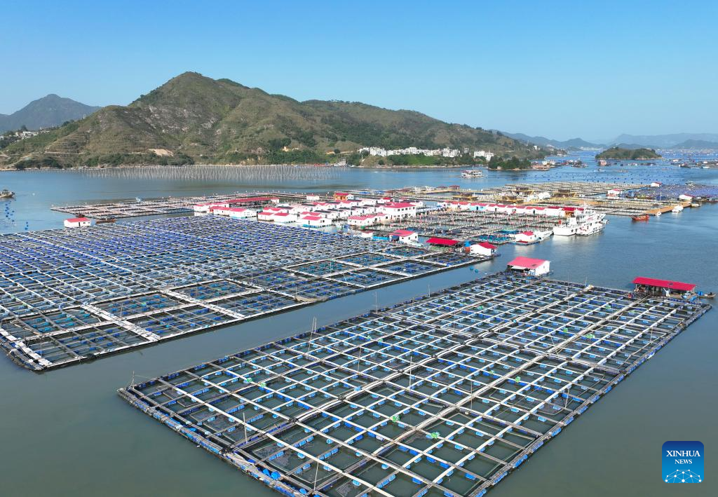 FUZHOU, 21 mayo, 2024 (Xinhua) -- Imagen aérea tomada con un dron del 11 de enero de 2024 de una zona de maricultura, en el distrito de Xiapu, en la provincia de Fujian, en el sureste de China. Situada junto al Mar Oriental de China, la provincia de Fujian cuenta con una superficie marítima de 136.000 kilómetros cuadrados, una costa escarpada y numerosas bahías e islas, lo que la convierte en un lugar óptimo para el desarrollo de la maricultura. A lo largo de los años, Fujian se ha concentrado en aumentar los suministros de alimentos pesqueros marinos de alta calidad, y acelerar la mejora de la maricultura al tiempo que protege el entorno ecológico marino. En 2023, la producción de maricultura de Fujian fue de casi 5,8 millones de toneladas, ocupando el segundo lugar en el país. (Xinhua/Jiang Kehong)
