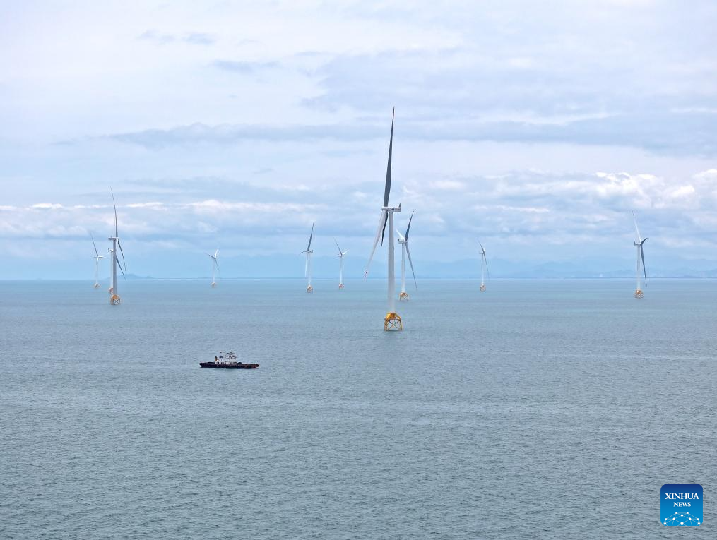 FANGCHENGGANG, 22 mayo, 2024 (Xinhua) -- Imagen del 21 de mayo de 2024 de las unidades de turbina eólica de un parque eólico, frente a la costa de Fangchenggang, en la región autónoma zhuang de Guangxi, en el sur de China. El parque eólico en construcción es el primer proyecto de demostración de energía eólica de Guangxi, que constará de 83 unidades de turbina eólica. (Xinhua/Zhou Hua)
