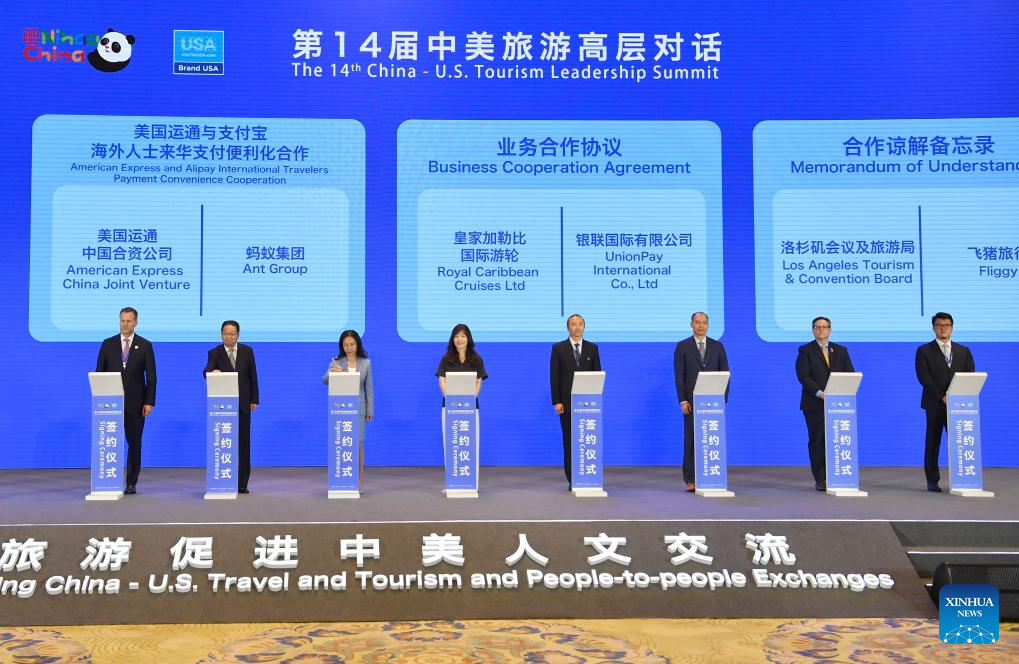 XI'AN, 22 mayo, 2024 (Xinhua) -- Imagen del 22 de mayo de 2024 de una ceremonia de firma durante la XIV Cumbre de Liderazgo Turístico China-Estados Unidos, en Xi'an, en la provincia de Shaanxi, en el noroeste de China. La cumbre, inaugurada en Xi'an el miércoles, tiene como lema "Ampliando los viajes y el turismo entre China y Estados Unidos e intercambios entre los pueblos". Ha sido coorganizada por el Ministerio de Cultura y Turismo de China, el Gobierno Popular de la provincia de Shaanxi, el Departamento de Comercio estadounidense y Brand USA. (Xinhua/Shao Rui)