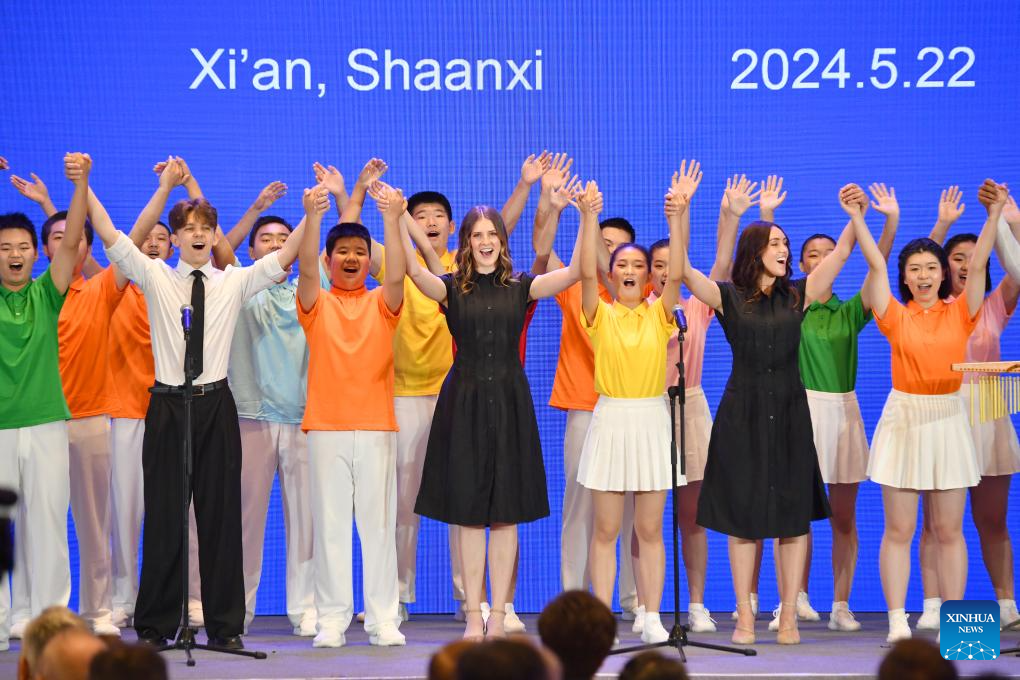 XI'AN, 22 mayo, 2024 (Xinhua) -- Estudiantes chinos y estadounidenses se presentan en la ceremonia de inauguración de la XIV Cumbre de Liderazgo Turístico China-Estados Unidos, en Xi'an, en la provincia de Shaanxi, en el noroeste de China, el 22 de mayo de 2024. La cumbre, inaugurada en Xi'an el miércoles, tiene como lema "Ampliando los viajes y el turismo entre China y Estados Unidos e intercambios entre los pueblos". Ha sido coorganizada por el Ministerio de Cultura y Turismo de China, el Gobierno Popular de la provincia de Shaanxi, el Departamento de Comercio estadounidense y Brand USA. (Xinhua/Shao Rui)