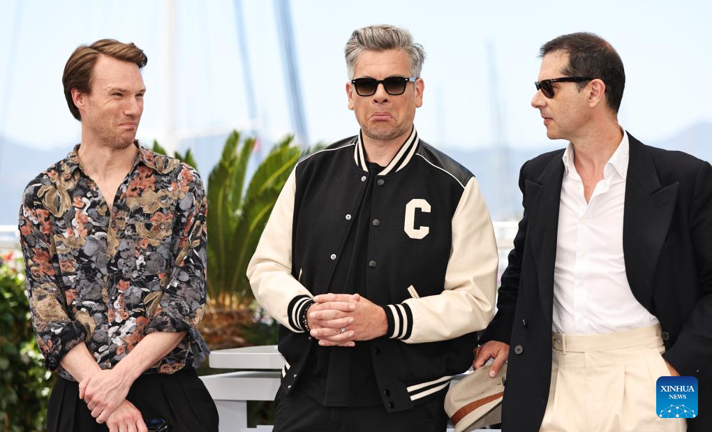 CANNES, 22 mayo, 2024 (Xinhua) -- Los actores franceses Melvil Poupaud (d) y Benjamin Biolay (c), y el actor británico, Hugh Skinner, posan durante una sesión fotográfica para la película "Marcello Mio" en el 77 Festival de Cine de Cannes, en Cannes, en el sur de Francia, el 22 de mayo de 2024. (Xinhua/Gao Jing)