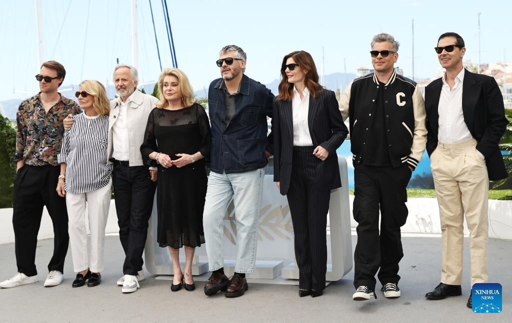 CANNES, 22 mayo, 2024 (Xinhua) -- El director francés, Christophe Honore (4-d), y miembros del elenco posan durante una sesión fotográfica para la película "Marcello Mio" en el 77 Festival de Cine de Cannes, en Cannes, en el sur de Francia, el 22 de mayo de 2024. (Xinhua/Gao Jing)