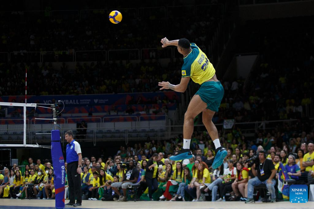 RIO DE JANEIRO, 22 mayo, 2024 (Xinhua) -- Imagen del 21 de mayo de 2024 de Darlan Ferreira Souza, de Brasil, sirviendo el balón durante el partido de la ronda preliminar de la Liga de Naciones de Voleibol 2024 masculina de la Federación Internacional de Voleibol (FIVB) entre Cuba y Brasil, en Río de Janeiro, Brasil. (Xinhua/Claudia Martini)