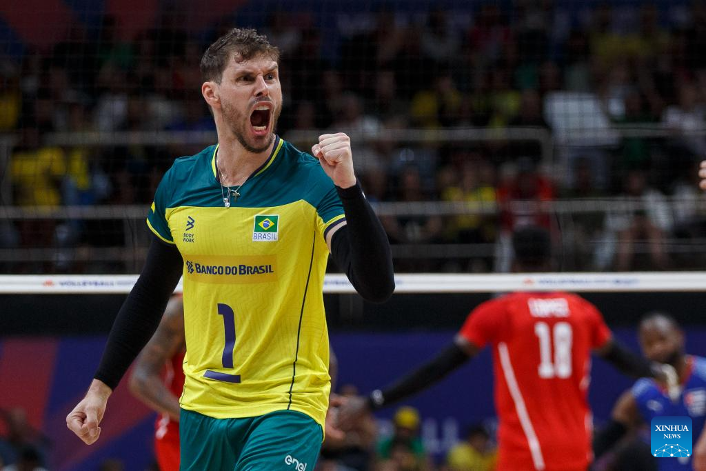 RIO DE JANEIRO, 22 mayo, 2024 (Xinhua) -- Imagen del 21 de mayo de 2024 de Bruno Mossa Rezende, de Brasil, reaccionando durante el partido de la ronda preliminar de la Liga de Naciones de Voleibol 2024 masculina de la Federación Internacional de Voleibol (FIVB) entre Cuba y Brasil, en Río de Janeiro, Brasil. (Xinhua/Claudia Martini)