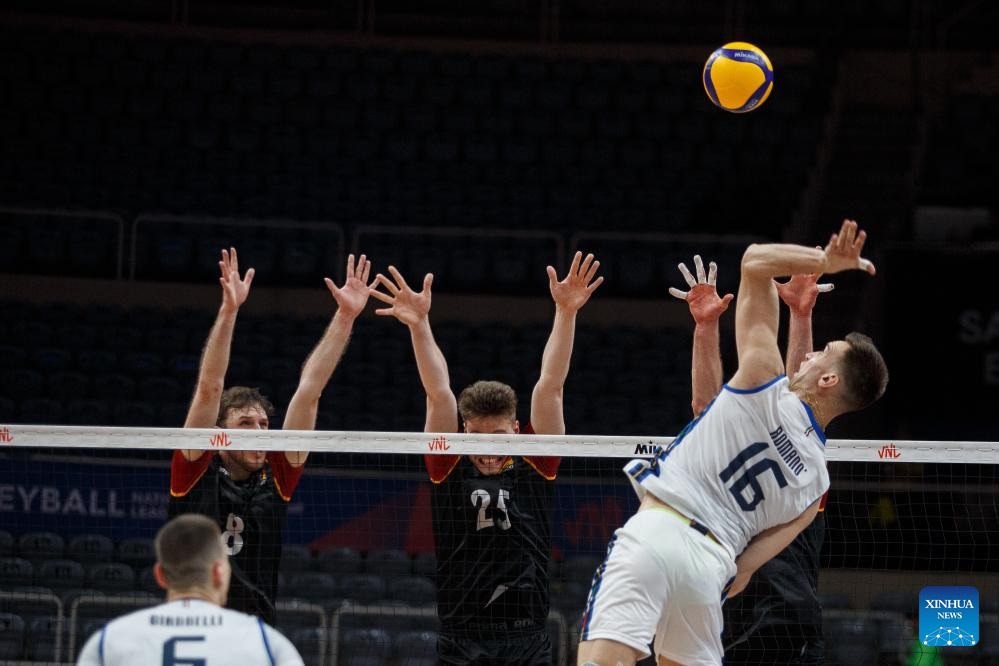 RIO DE JANEIRO, 23 mayo, 2024 (Xinhua) -- Imagen del 22 de mayo de 2024 de Galassi (i-frente), de Italia, rematando el balón durante el partido de la ronda preliminar de la Liga de Naciones de Voleibol 2024 masculina de la Federación Internacional de Voleibol (FIVB) entre Alemania e Italia, en Río de Janeiro, Brasil. (Xinhua/Claudia Martini)