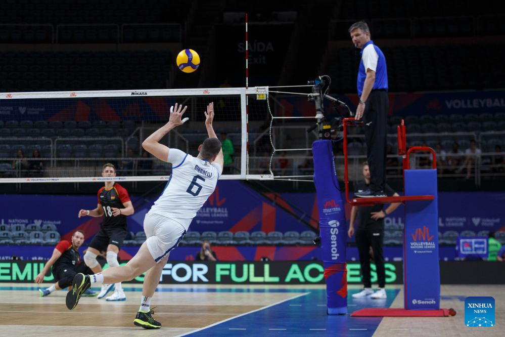 RIO DE JANEIRO, 23 mayo, 2024 (Xinhua) -- Imagen del 22 de mayo de 2024 de Romanó (d-frente), de Italia rematando el balón durante el partido de la ronda preliminar de la Liga de Naciones de Voleibol 2024 masculina de la Federación Internacional de Voleibol (FIVB) entre Alemania e Italia, en Río de Janeiro, Brasil. (Xinhua/Claudia Martini)