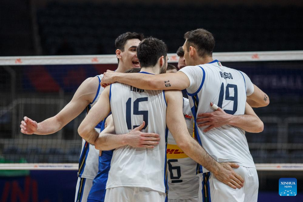 RIO DE JANEIRO, 23 mayo, 2024 (Xinhua) -- Imagen del 22 de mayo de 2024 de jugadores de Italia festejando durante el partido de la ronda preliminar de la Liga de Naciones de Voleibol 2024 masculina de la Federación Internacional de Voleibol (FIVB) entre Alemania e Italia, en Río de Janeiro, Brasil. (Xinhua/Claudia Martini)