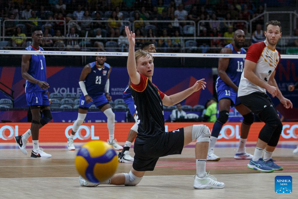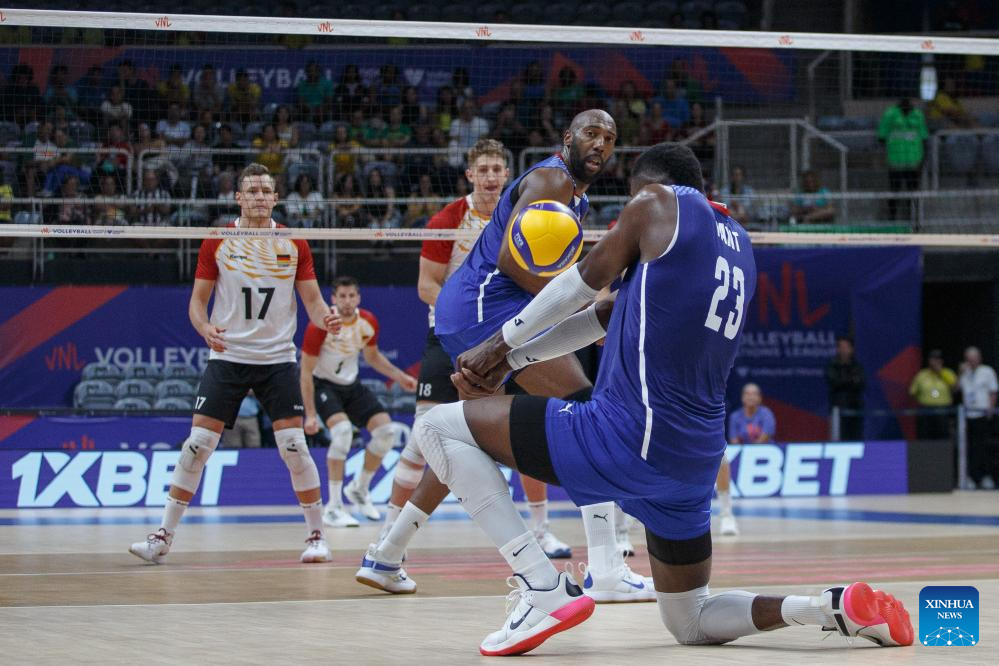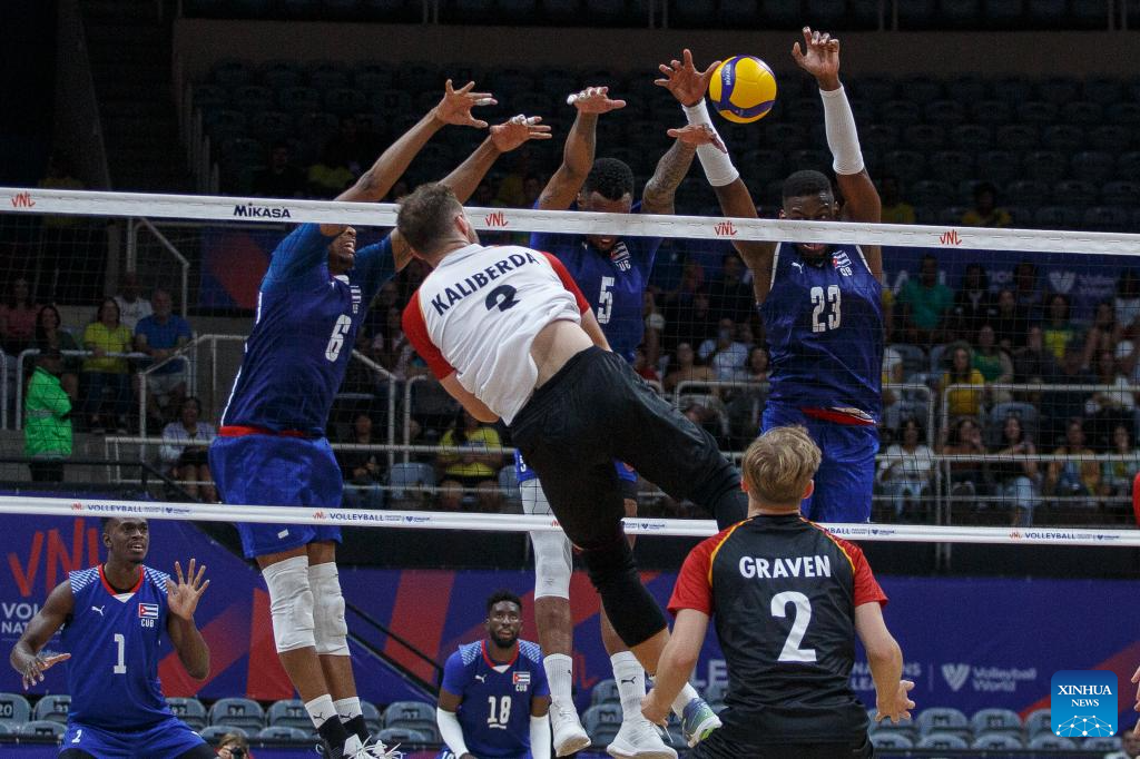 RIO DE JANEIRO, 23 mayo, 2024 (Xinhua) -- Denis Kaliberda (c-frente), de Alemania, intenta salvar el balón durante el partido de la ronda preliminar de la Liga de Naciones de Voleibol 2024 masculina de la Federación Internacional de Voleibol (FIVB) entre Cuba y Alemania, en Río de Janeiro, Brasil, el 23 de mayo de 2024. (Xinhua/Claudia Martini)