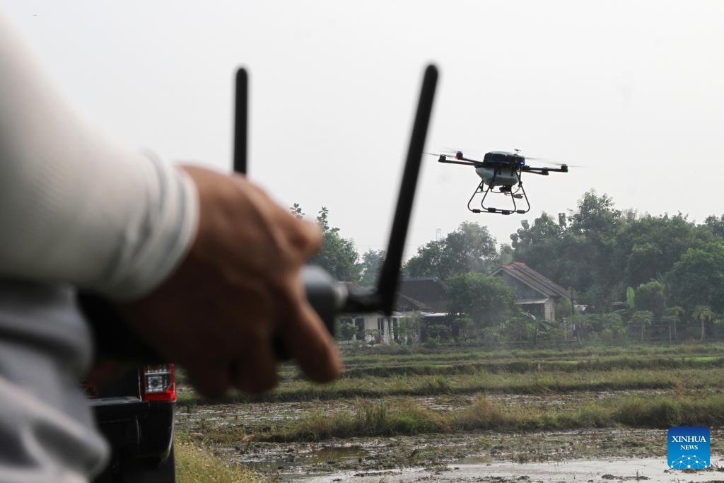 SUKOHARJO, 23 mayo, 2024 (Xinhua) -- Imagen del 23 de mayo de 2024 de un dron agrícola volando sobre un campo de arroz, en Sukoharjo, Java Central, Indonesia, el 23 de mayo de 2024. Drones agrícolas son usados aquí para ayudar a los agricultores locales a realizar trabajo agrícola de una forma más eficiente, conveniente y segura. (Xinhua/Bram Selo)