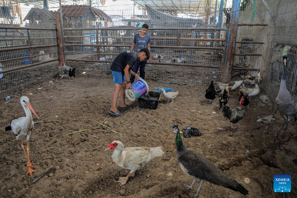 GAZA, 24 mayo, 2024 (Xinhua) -- Imagen del 23 de mayo de 2024 de un niño cuidando a aves evacuadas del Zoológico de Rafah en una instalación de guardería, en la ciudad de Khan Younis, en el sur de la Franja de Gaza. Estos animales han sido evacuados debido al actual conflicto palestino-israelí. (Xinhua/Rizek Abdeljawad)