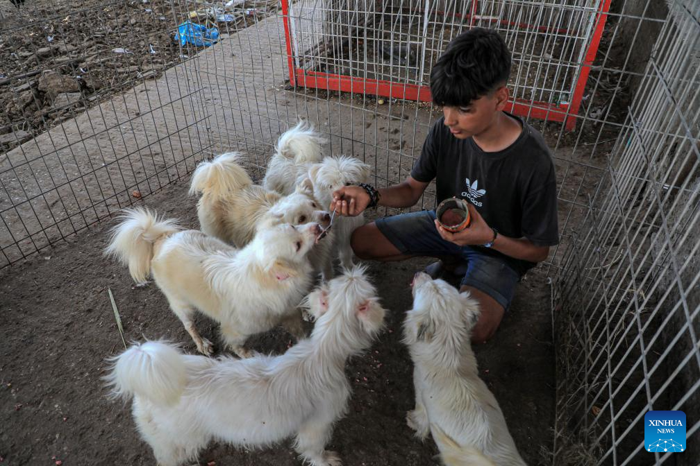 GAZA, 24 mayo, 2024 (Xinhua) -- Imagen del 23 de mayo de 2024 de un niño cuidando a perros evacuados del Zoológico de Rafah en una instalación de guardería, en la ciudad de Khan Younis, en el sur de la Franja de Gaza. Estos animales han sido evacuados debido al actual conflicto palestino-israelí. (Xinhua/Rizek Abdeljawad)